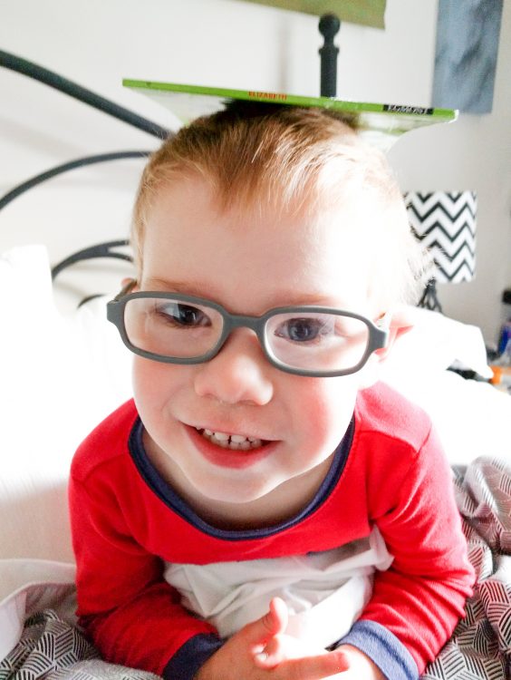LJ woke up in a great mood today. Next thing I know he’s in our bed with a handful of books, balancing the books on his head and giggling away happily.
