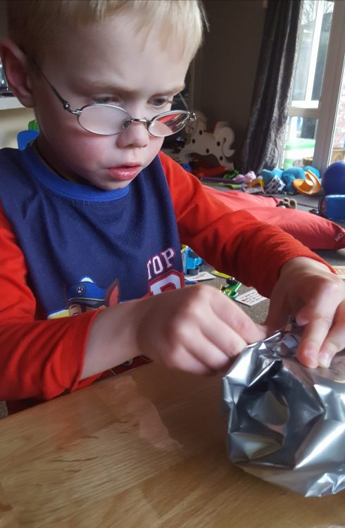 Today CJ had a special job – he had to wrap a birthday present for Nan.