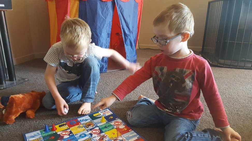 Tonight before bed the boys wanted to play a board game. We started with Snake’s and Ladders, so LJ could play.