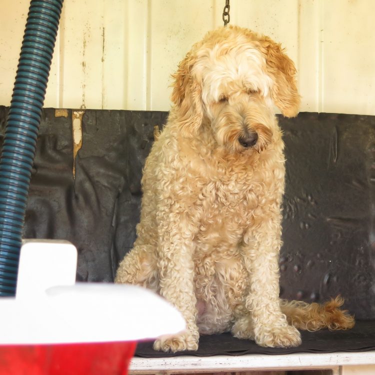 This isn’t as bad as it looks! Molly isn’t sad, she is puzzled by the fan on the floor of Jim’s Dog Wash trailer – it wasn’t there last time I had my haircut!!
