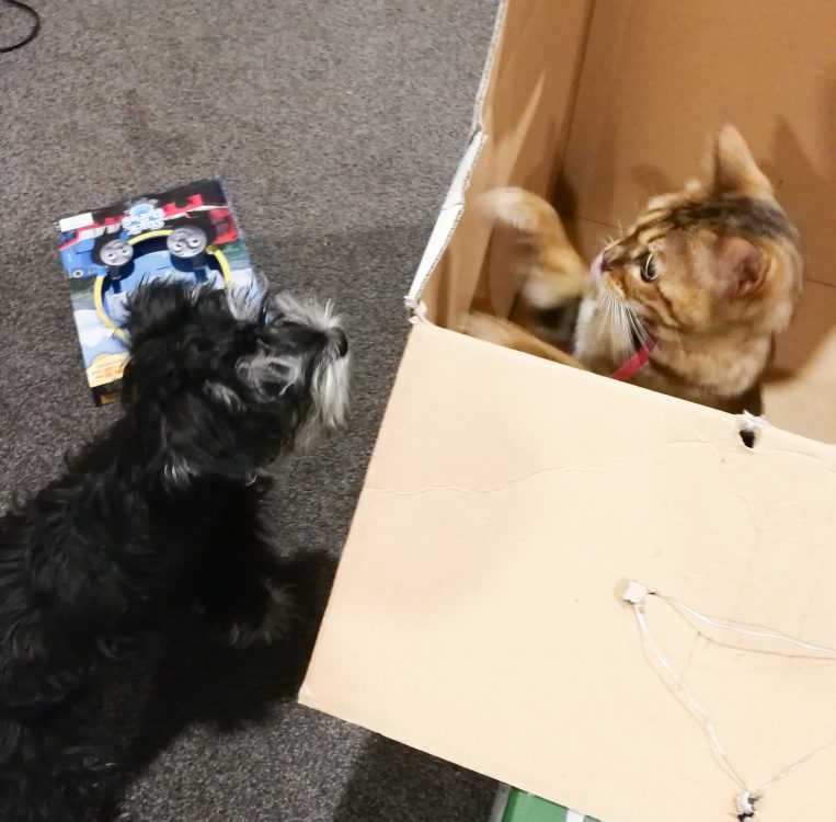 Toffee hiding in a box, attacking sudo for a game as she passes… I think our dog is starting to think she’s a cat.