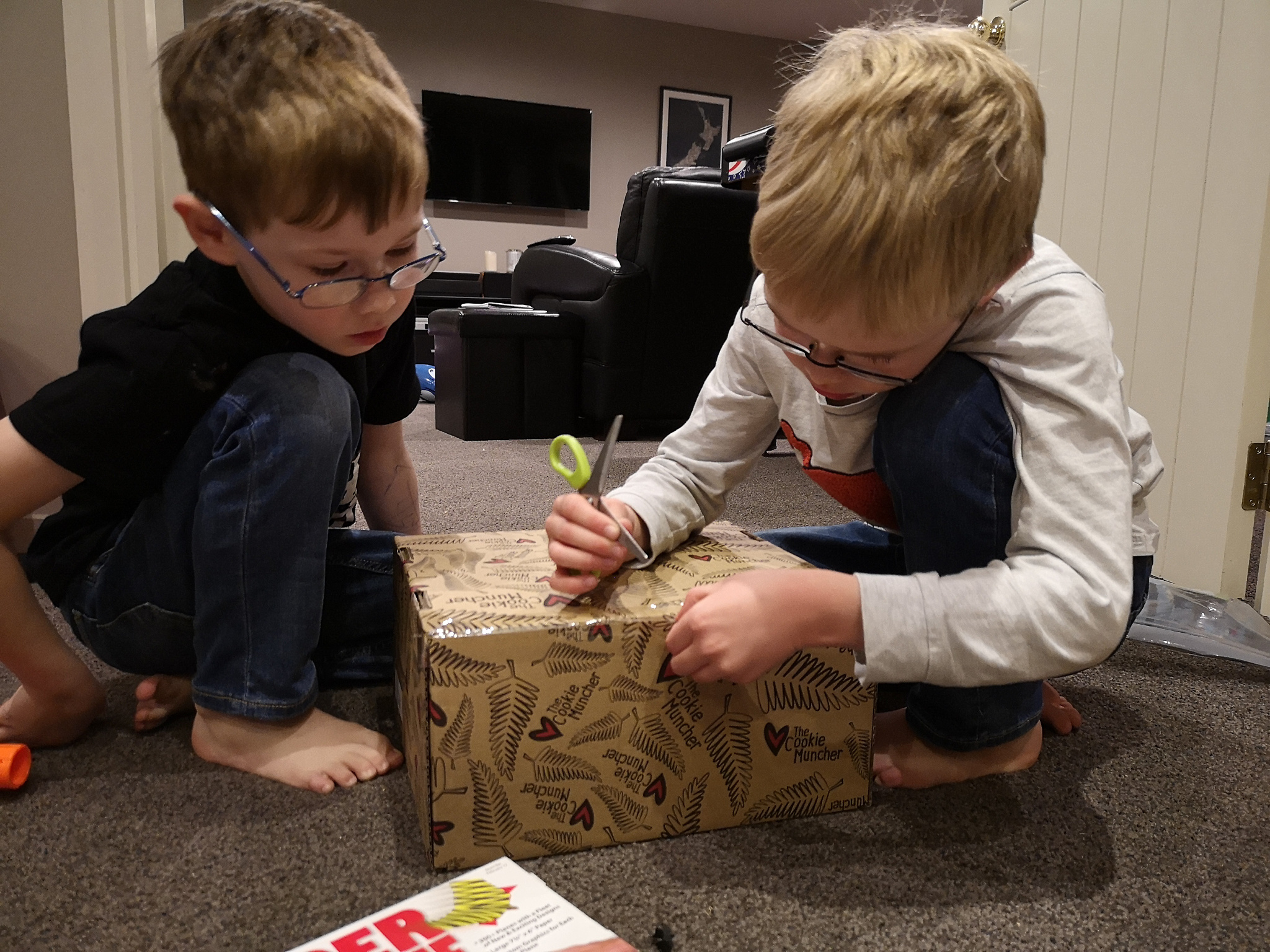 With deliveries opening back up, someone must have thought they needed a special delivery of excitement. LJ just about turned himself inside out with excitement when he found the box was full of chocolate cookies.