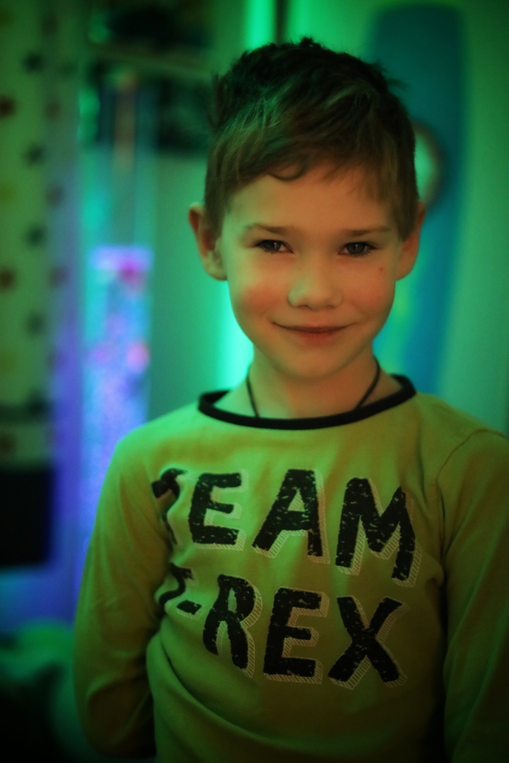 LJ sleeps with a giant colour changing bubble lamp on. It hums away flowing in his room.