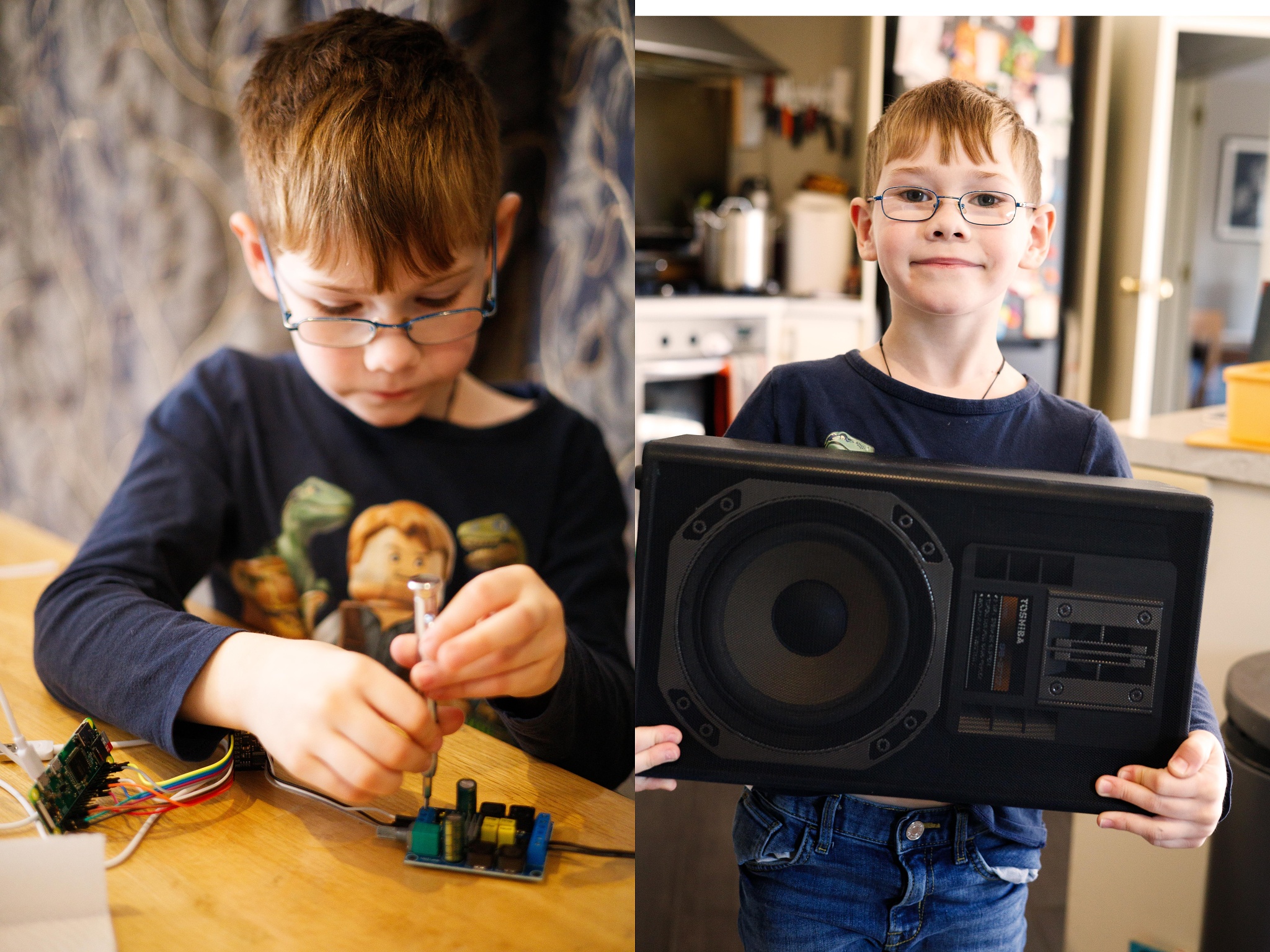A raspberry pi, dac, amp and relay, plus an hour, and he has a shiny new stereo.